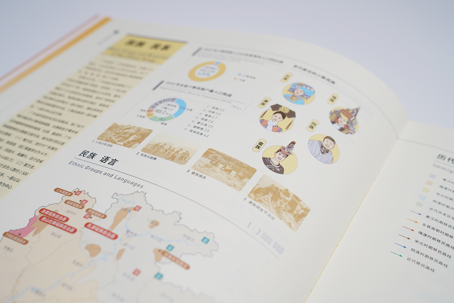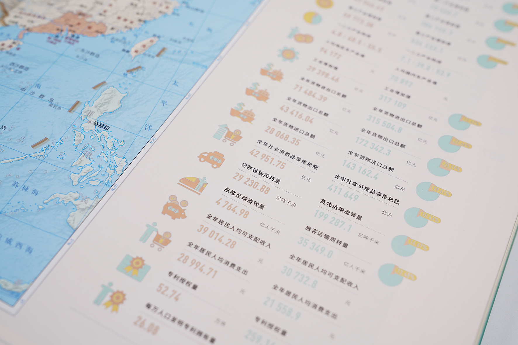图集设计工作包含地图整饰设计、统计地图系统设计、色彩系统设计、数据图表设计、插图设计、版式设计、装帧设计在内的书籍整体设计,共计专题地图49幅、普通地图132幅、信息图表126个、手绘插图164幅、图片105张。
